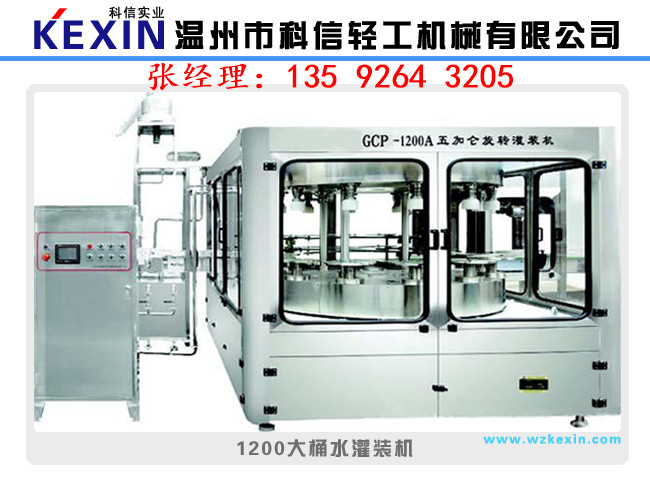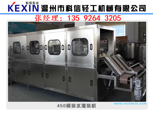 溫州科信輕工機械有限公司專業生產該生產線是供3-5加侖桶裝飲用水生產之用,型號有100型.200型.300型.450型.600型.900型和1200型。該系列桶裝生產線由洗瓶.灌裝和封口三部分組成。洗瓶機采用多道洗滌液噴射和消毒液噴射,達到洗滌.消毒的目的,消毒液可以循環使用。封口機可以自動封口,輸送瓶蓋過程口配有衛淋裝置,以確保瓶蓋無菌清潔。該系列生產線均可自動洗滌.消毒灌裝.計數和輸出。具有功能齊全.設計新穎.自動化程度高等特點,是集機.電.氣于一體的新型飲用水桶裝設備。