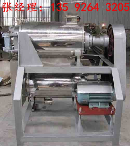 原料加入進料斗中,在螺旋的推進下受壓,其壓榨的汁液通過過濾網流入底部的盛汁器,而廢料則通過螺旋及調壓的錐形部份之間形成的環狀空隙排出,調壓頭沿軸向的移動右調整空隙的大小。用于順時針:從設備的出渣槽向進料斗端看轉動手輪軸承座時,調壓頭向左,空隙即縮小、反之則空隙變大。改變空隙的大小,即調整排渣的阻力,即可改變出渣率,但如果空隙過小,在強力擠壓下,部分渣的顆粒會和汁一起通過過濾網被擠出,盡管出汁率增加,但汁的質量相對下降,空隙的大小應視用戶具體工藝要求而定。
